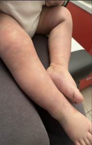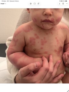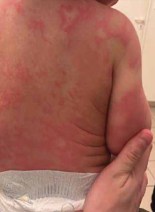 Un nourrisson de 11 mois 1/2 est amené en consultation pour fièvre. Dans ses antécédents personnels une sténose du pylore à 6 semaines de vie et une allergie aux protéines du lait de vache (APLV) chez les 2 parents. Le diagnostic de laryngite et d’otite moyenne aiguë (OMA) est posé et un traitement par amoxicilline prescrit pour une semaine. Plusieurs antibiothérapies par amoxicilline avaient déjà été données pour des OMA. Huit jours plus tard l’antibiotique est terminé mais une éruption impressionnante apparaît. Aux urgences pédiatriques, l’hypothèse d’un Parvovirus B19 est soulevée. L’éruption s’étend le lendemain avec fièvre à 38.5 et prurit. Il n’est pas noté d’atteinte des muqueuses.